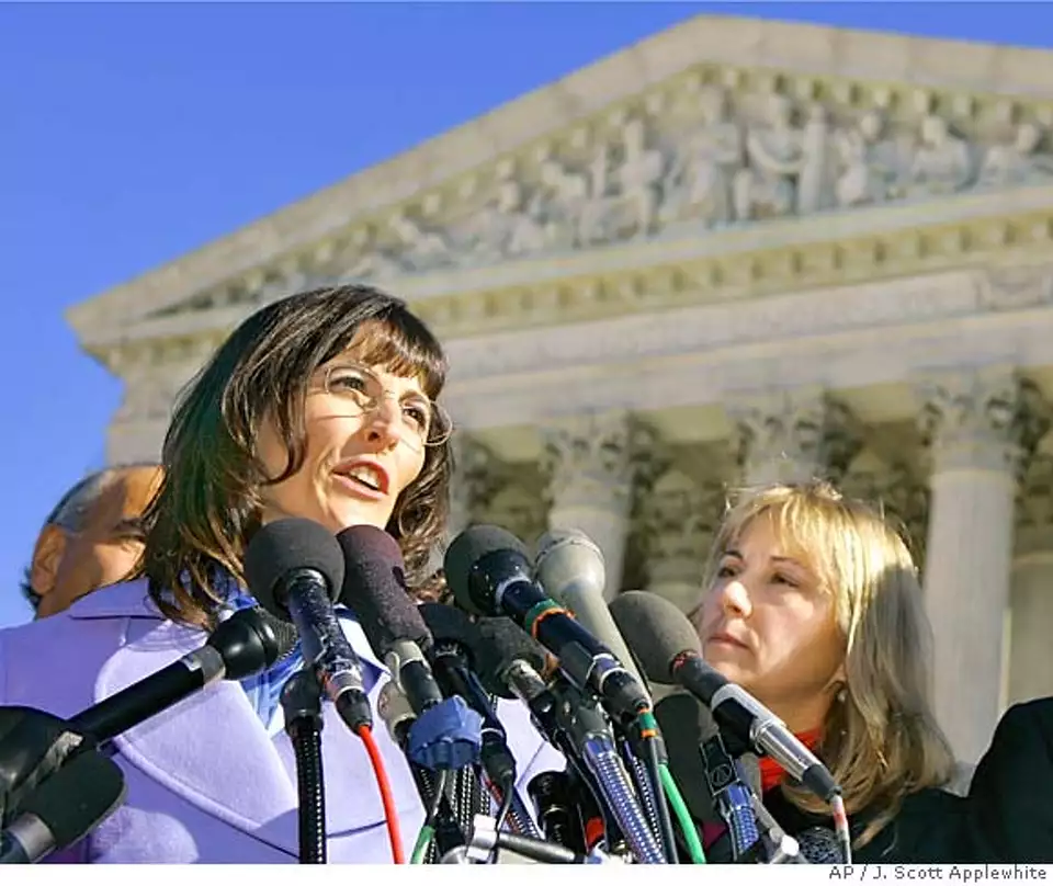 Angel Raich and Diane Monson speaking outside the Supreme Court | Credit: SFGATE